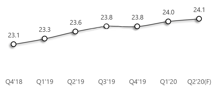 2018Q4~2020Q2全球液晶显示器面板出货平均尺寸(单位:Inch)