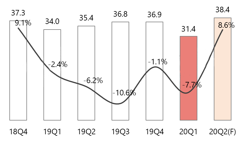 2018Q4~2020Q2全球液晶显示器面板出货量及YoY(单位:百万片, %)