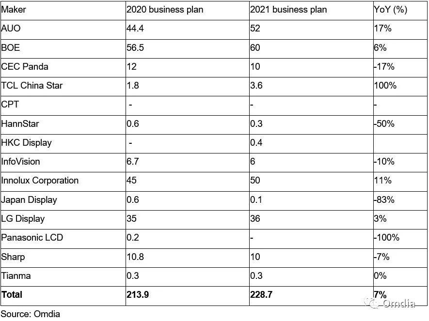 Omdia预计,笔记本电脑显示面板的强劲需求至少将持续到2021年上半年。新学期的需求和远程工作的扩大化将成为主要驱动力。面板厂商正更专注于显示器面板业务。三星显示将在2021年第一季度退出液晶显示器面板业务。因此,其他面板厂商正在争夺三星退出而空出的份额。2021年液晶电视面板的出货量可能会同比下降5%(YoY)。由于在液晶电视市场的地位已经固定,中国一线面板厂商更加注重IT面板业务的发展。
