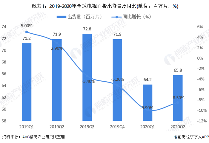 2020年伊始,受新冠疫情以及全球政治经济环境变化影响,全球消费市场面临巨大挑战。电视产业链所受波及明显,一方面是疫情对产业链复工率,物流,生产产生负面影响,另一方面消费信心下降以及体育赛事推迟影响电视整机出货预期。2020年上半年全球电视面板出货1.3亿片,同比下降9.2%,出货面积78.8百万平米,同比小幅下降0.5%。