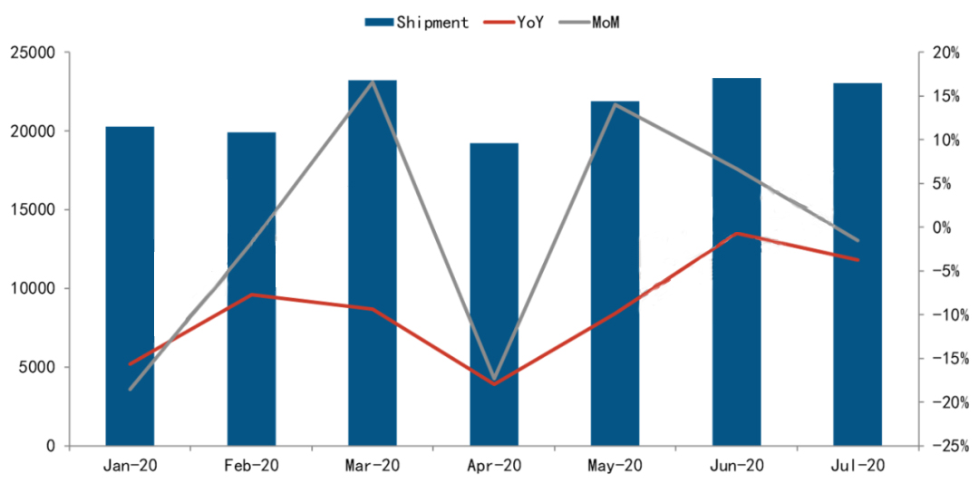 根据最新发布的《全球TV液晶面板月度市场追踪》报告显示,2020年7月,全球TV液晶面板出货23.0M,同比下滑4%,环比下滑2%。