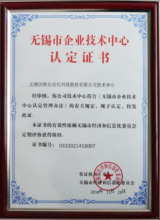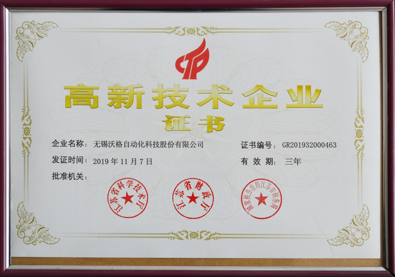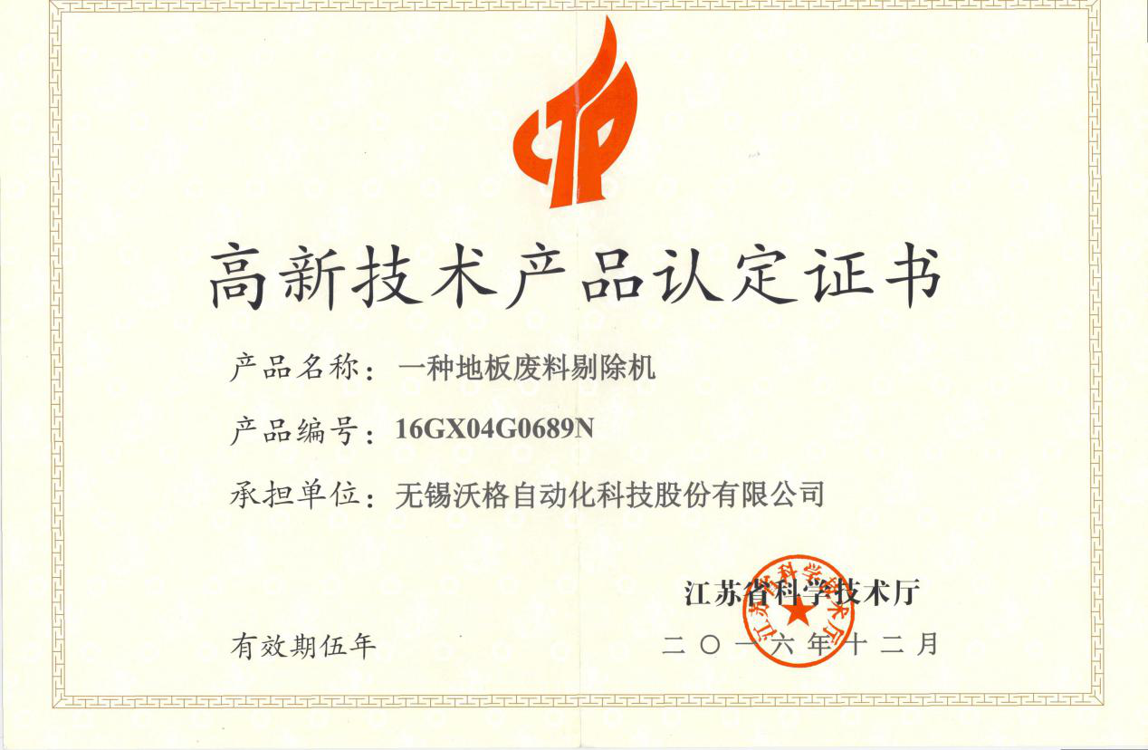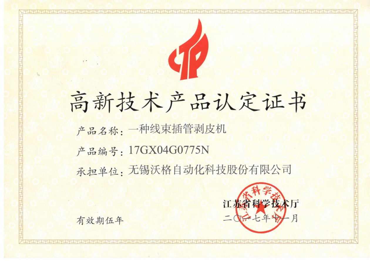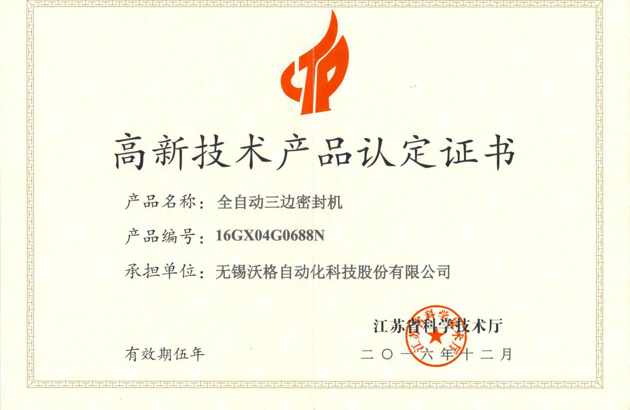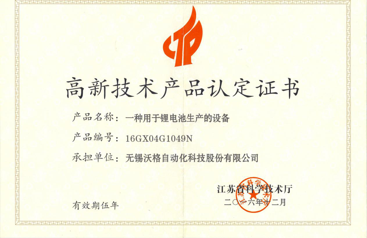近年来,公司先后获得的高新技术产品认定证书有“锂电池曲面热压机”、“ 全自动三边密封机”、“ 一种地板废料剔除机”、“ 一种用于锂电池生产的设备”、“一种线束插管剥皮机”、“基于多关节工业机器人的螺丝锁拆自动化成套设备”等。